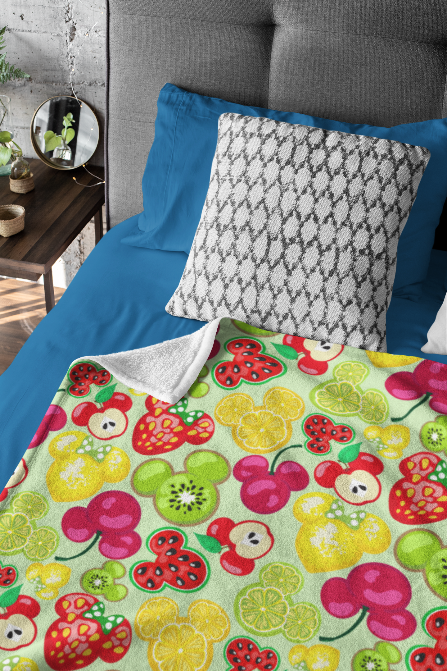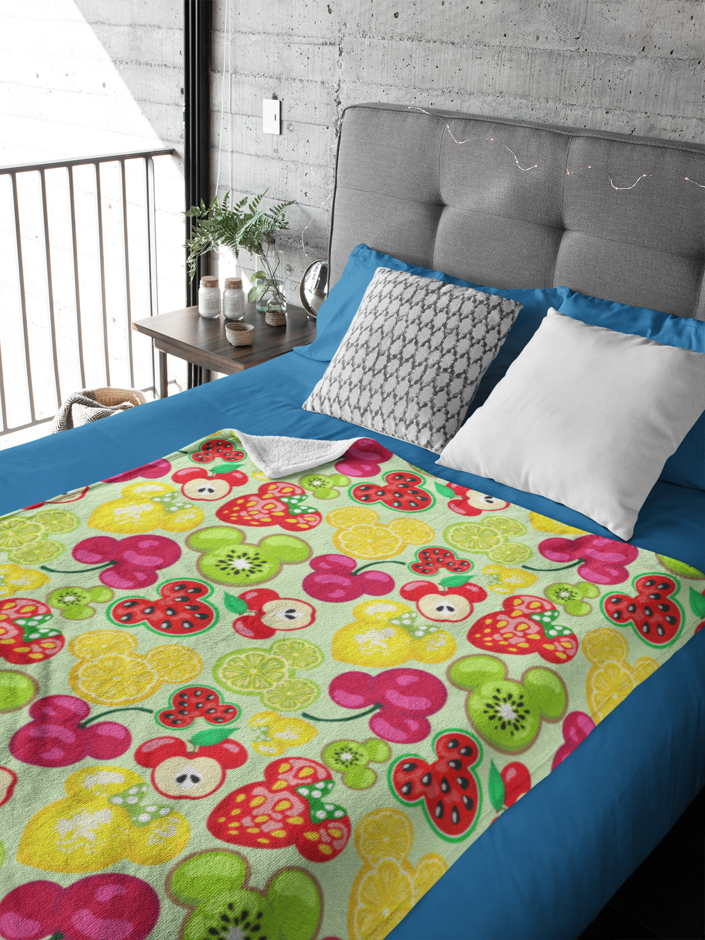 Wrap up in the softest embrace imaginable with this luxurious blanket featuring all your favorite summer fruits in the shape of Mouse Ears! Made from high-quality fabric, this blanket is not only incredibly soft but also durable, ensuring years of cozy comfort.